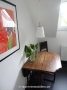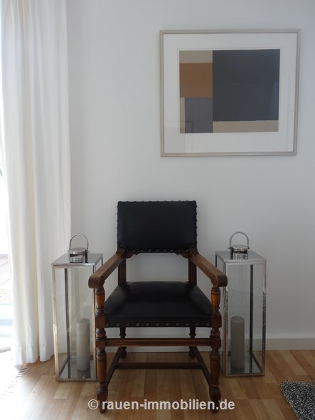 Wohnzimmer mit Sitzgruppen, Couch und Schreibtisch, schwarz/weiß gefliestes Wannenbad mit Waschmaschine, separate Küche und Schlafzimmer, großzügige Südterrasse.